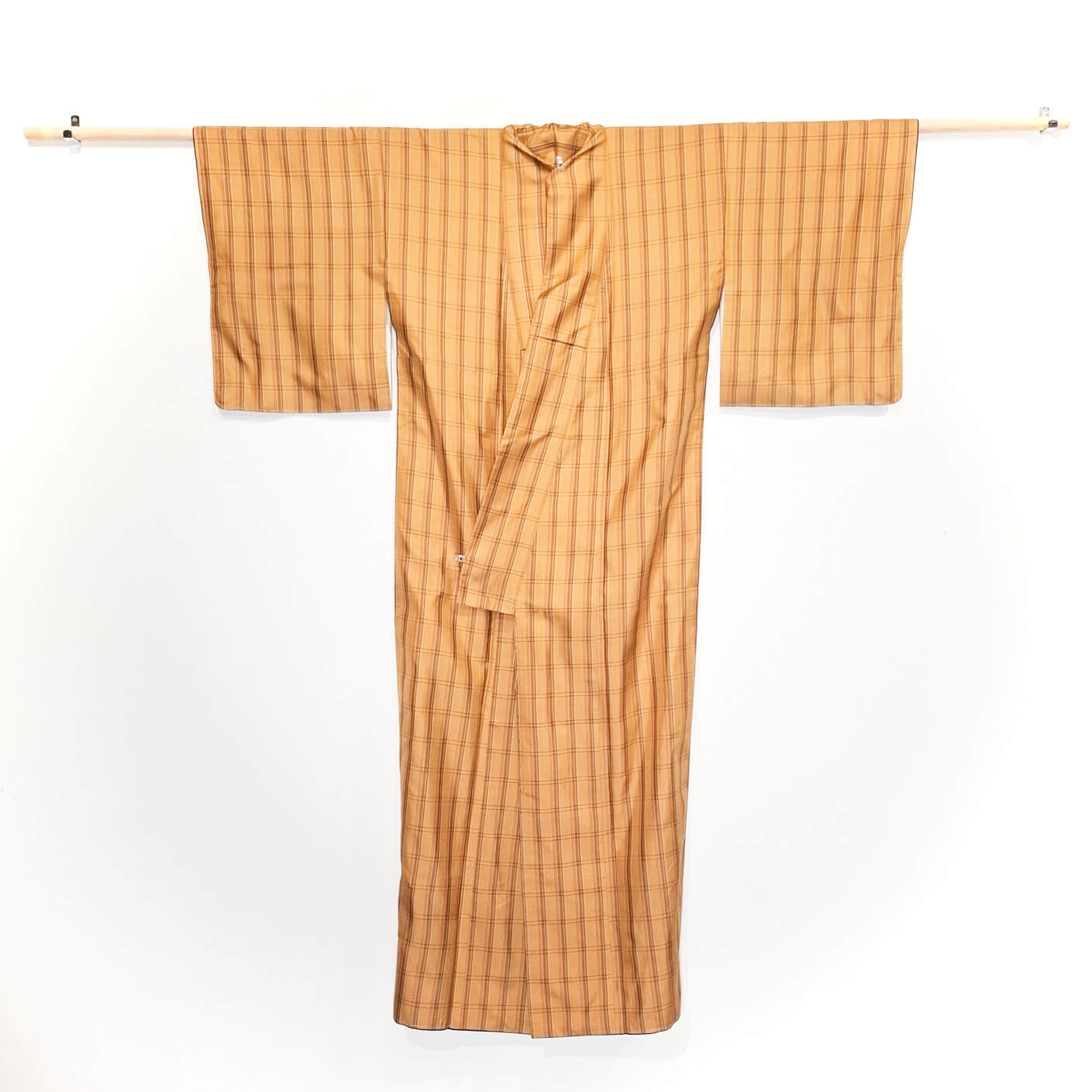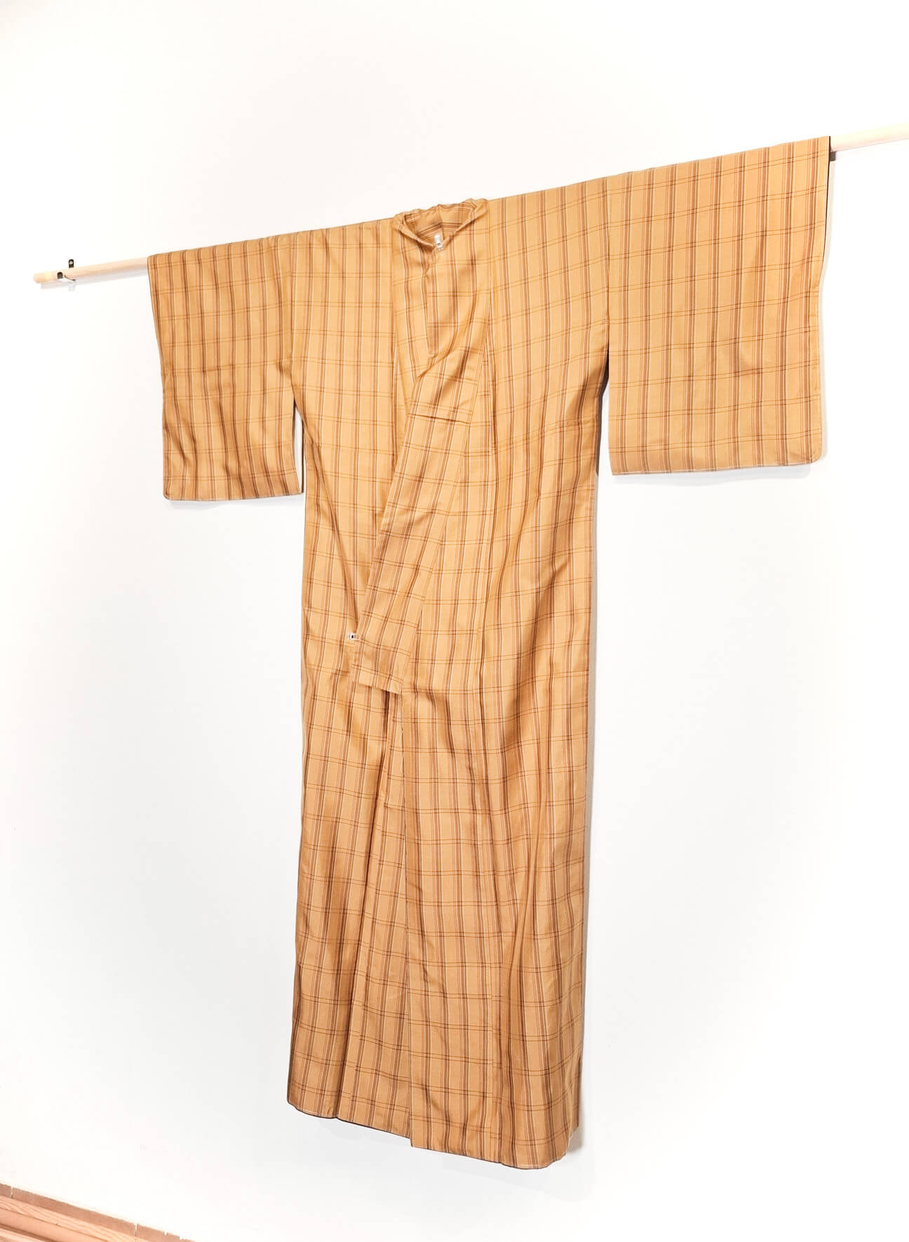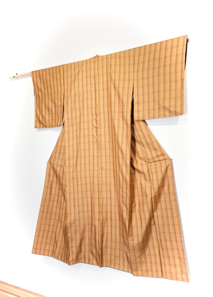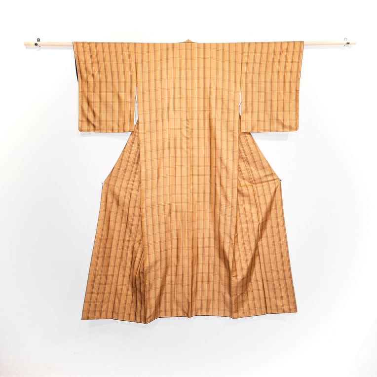 Authentischer japanischer Kimono in gedecktem Gelb mit Tartan-Muster. Dieses Stรผck ist vintage, aber in ausgezeichnetem Zustand.