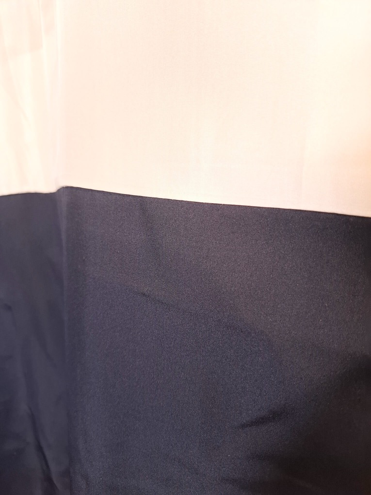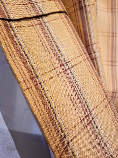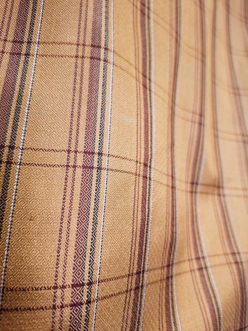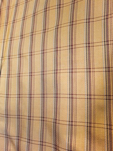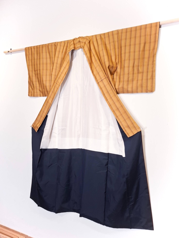 Dieser Kimono ist aus einem Mischgewebe gemacht mit angenehm griffiger Struktur. Die Grundfarbe ist ein zurรผckhaltendes Gelb (wie auf den letzten Fotos) mit einem feinen Tartan-Muster. Das Futter ist am Saum in dunklem Marineblau gehalten.