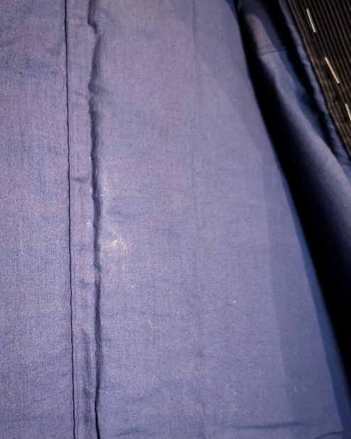Der Oberstoff ist Seide oder ein Seidenmischgewebe – schwarz mit feinen Nadelstreifen. Das Innenfutter ist aus blauer Baumwolle. Der Stoff fühlt sich angenehm fest und griffig an – perfekt auch zum Shamisen-Spielen, da nichts verrutscht oder rutschig wird 🙂