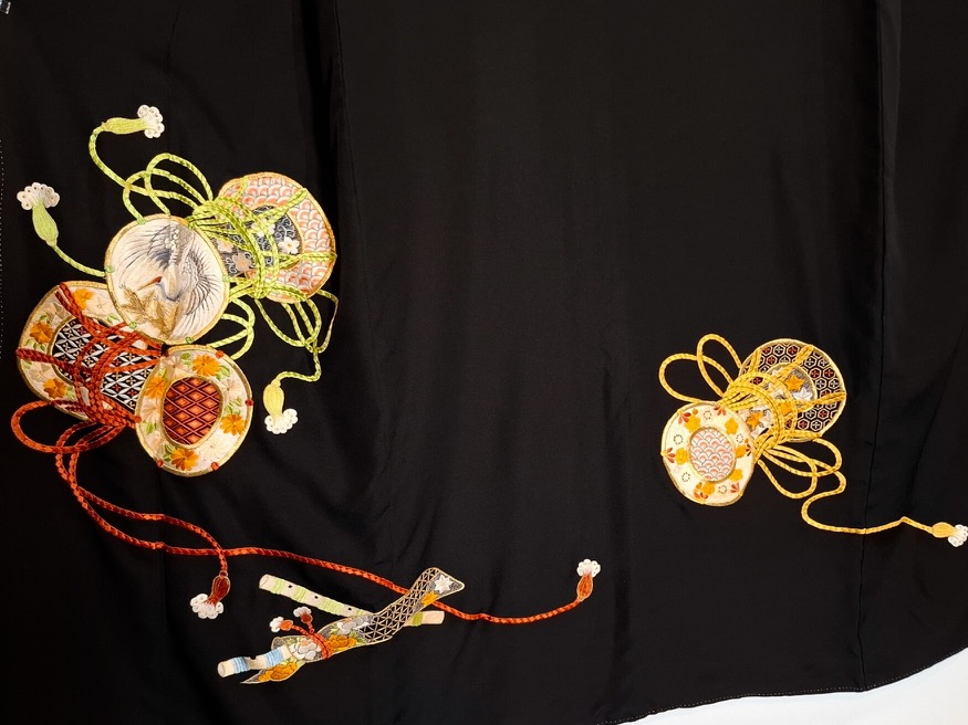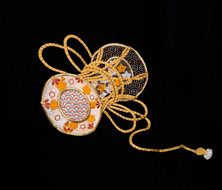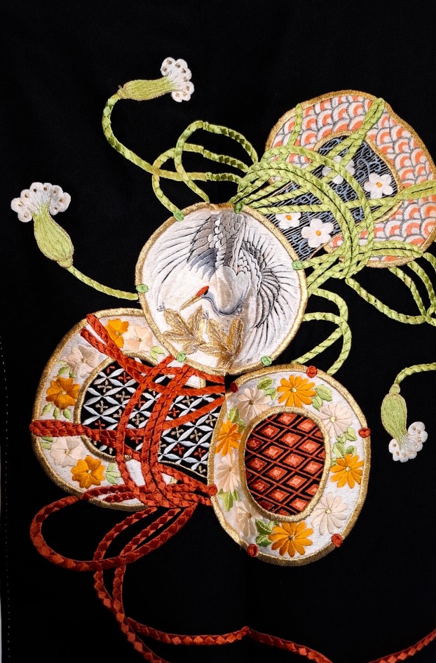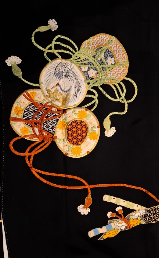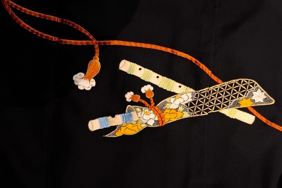 Die Trommeln und die Flötes sind von Hand gestickt – mit einer wahnsinnigen Liebe zum Detail! Man erkennt sogar die Struktur der Kordeln durch die kunstvolle Sticktechnik. Jede Trommel hat ein anderes dekoratives Muster, und die Art, wie sich die Schnüre winden und verschlingen, wirkt unglaublich lebendig. Wie wunderschön ist das bitte? Außerdem gibt es zwei Flöten, von denen eine in einer kimonoesken Hülle steckt. Ich liebe es!