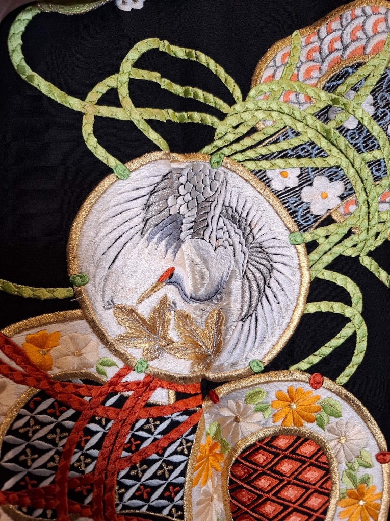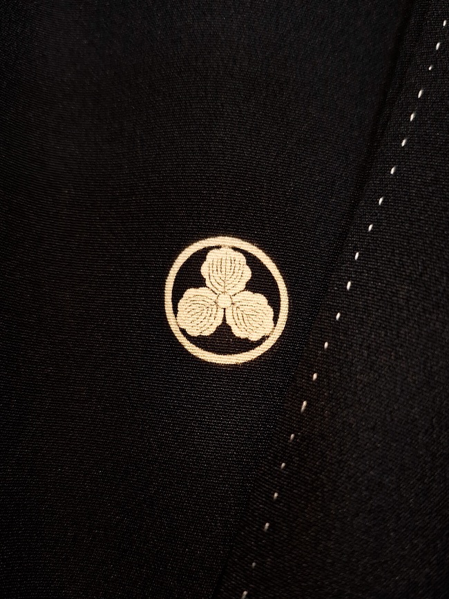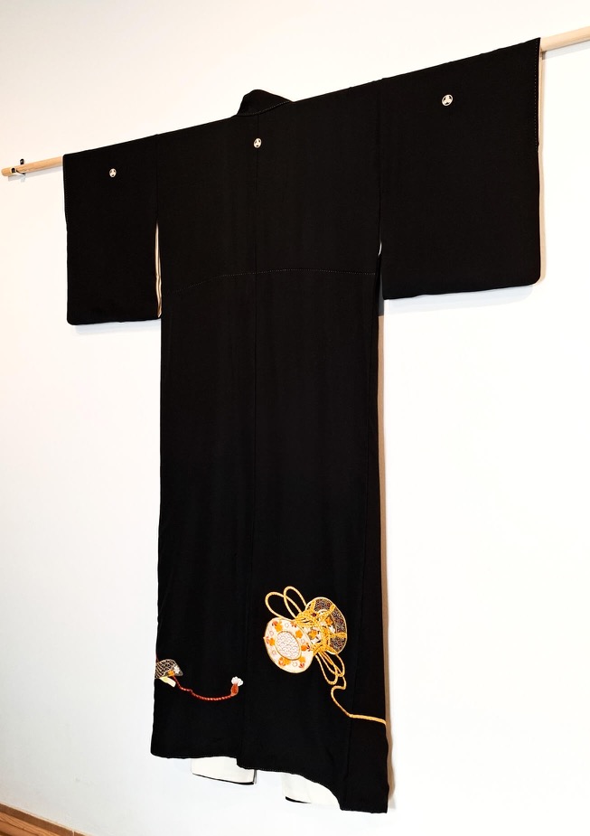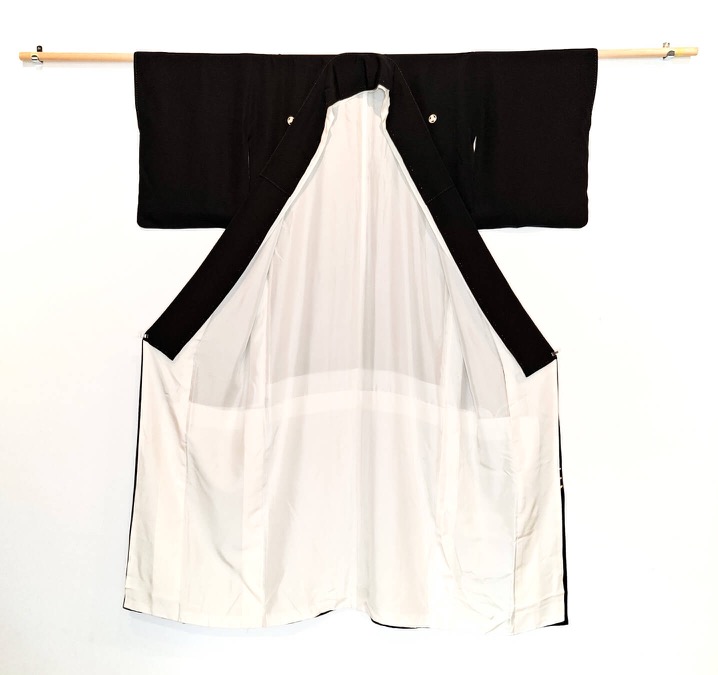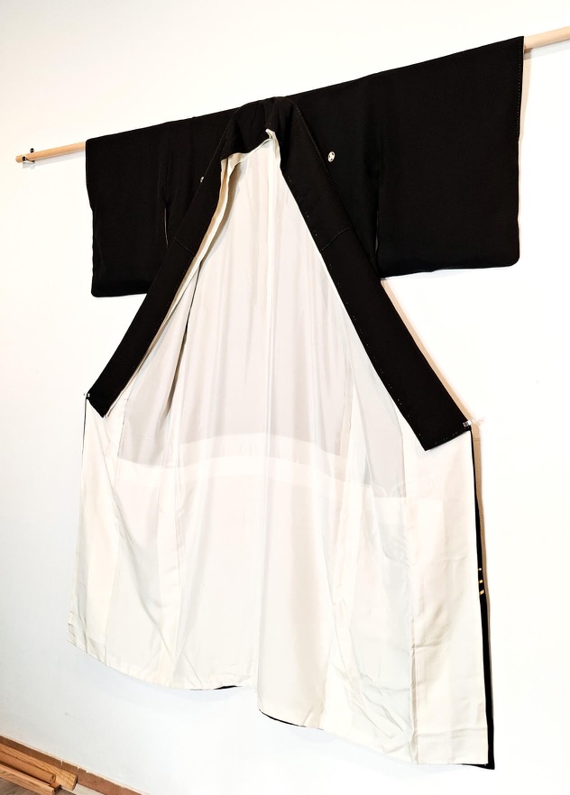 Dieser Kimono ist eigentlich zwei Kimonos in einem: In den Hauptkimono ist ein komplett weißer Innenkimono eingenäht. Der äußere Kimono hat zusätzlich ein eigenes weißes Futter. Alles ist aus Seide gefertigt! Der schwarze Außenkimono besteht aus superweicher Chirimen-Seide – das ist die Seide mit einer geschmeidigen, aber gleichzeitig leicht griffigen Oberfläche und einem sehr edlen, dezenten Glanz (mein persönlicher Favorit).