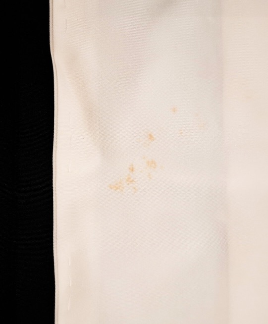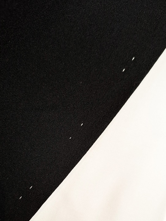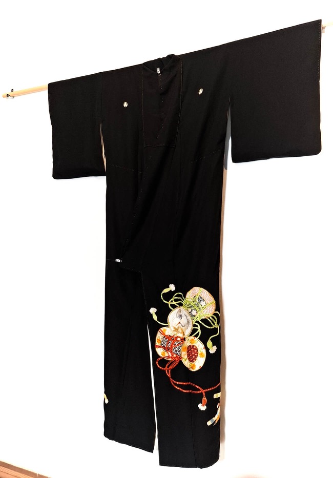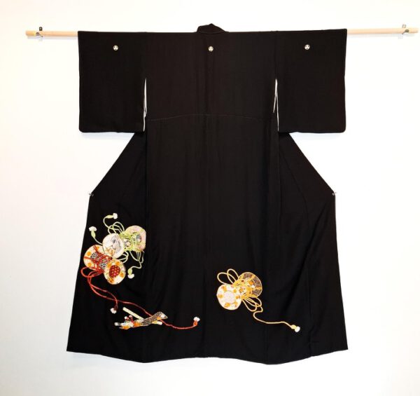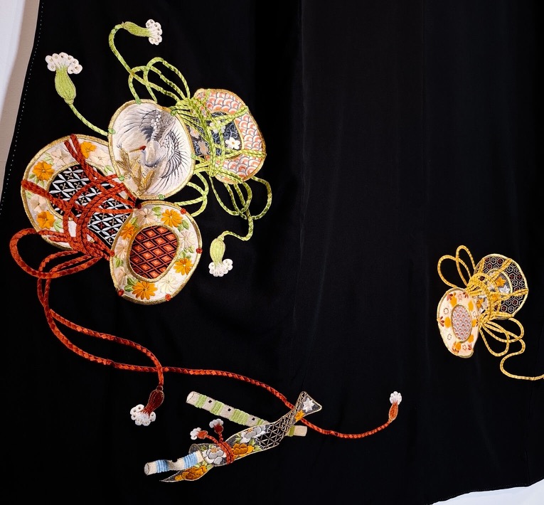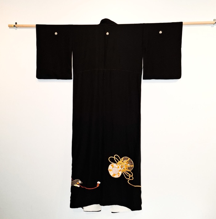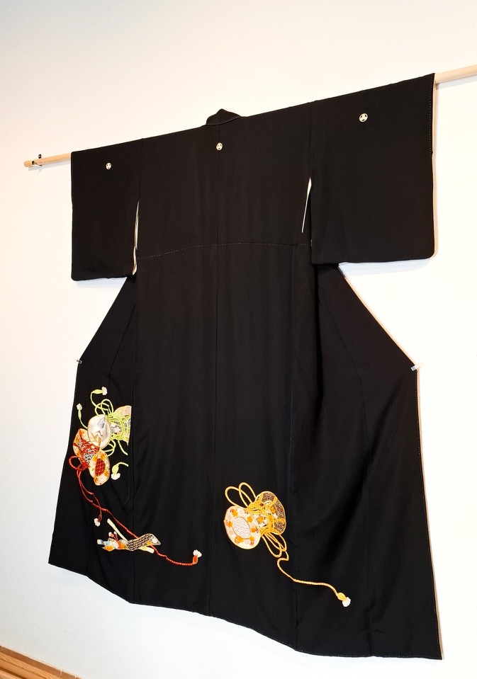 Dieser Kimono ist eigentlich zwei Kimonos in einem: In den Hauptkimono ist ein komplett weißer Innenkimono eingenäht. Der äußere Kimono hat zusätzlich ein eigenes weißes Futter. Alles ist aus Seide gefertigt! Der schwarze Außenkimono besteht aus superweicher Chirimen-Seide – das ist die Seide mit einer geschmeidigen, aber gleichzeitig leicht griffigen Oberfläche und einem sehr edlen, dezenten Glanz (mein persönlicher Favorit).