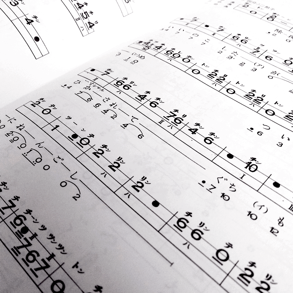 Enjoy this collection of 40 Kouta Style songs for shamisen! Printed notation book for Kouta Shamisen, volume 3 of 小唄名曲集 “Kouta Meikyokushuu” in bunkafu (tabulature) notation.