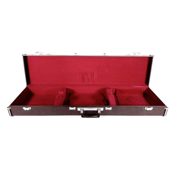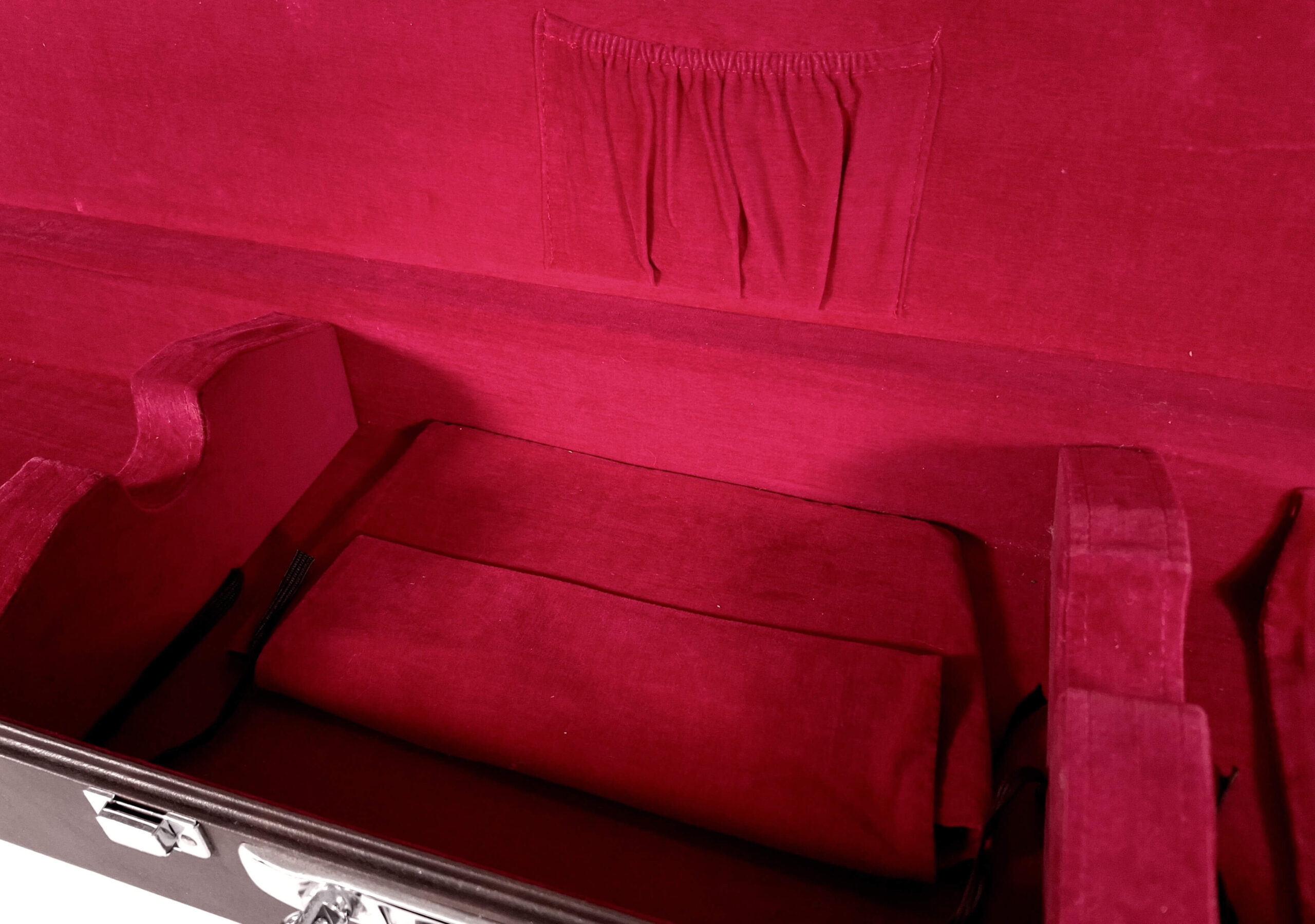 The red velvet lining complements the retro charm of the brown outer shell. The outer shell is synthetic and water repellent. The blocks your shamisen’s neck rests on is extra wide and padded. There’s a small little pocket on the inside lid and a larger pocket on the inside bottom that fits your bachi and other playing accessories. The case also has feet on the short bottom side and an extra handle on the short top side for easy upright maneuvering and storage.