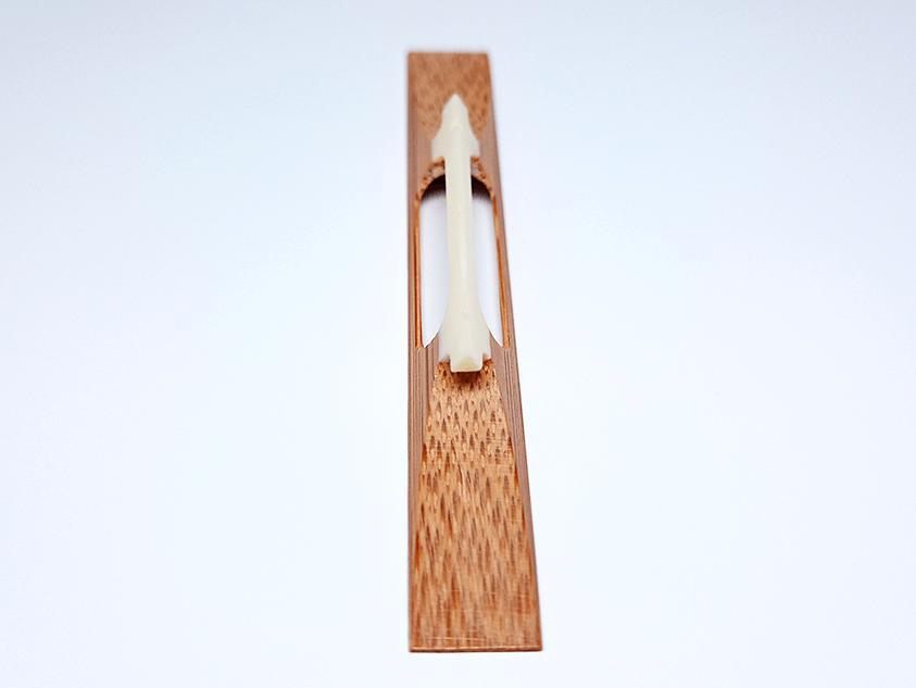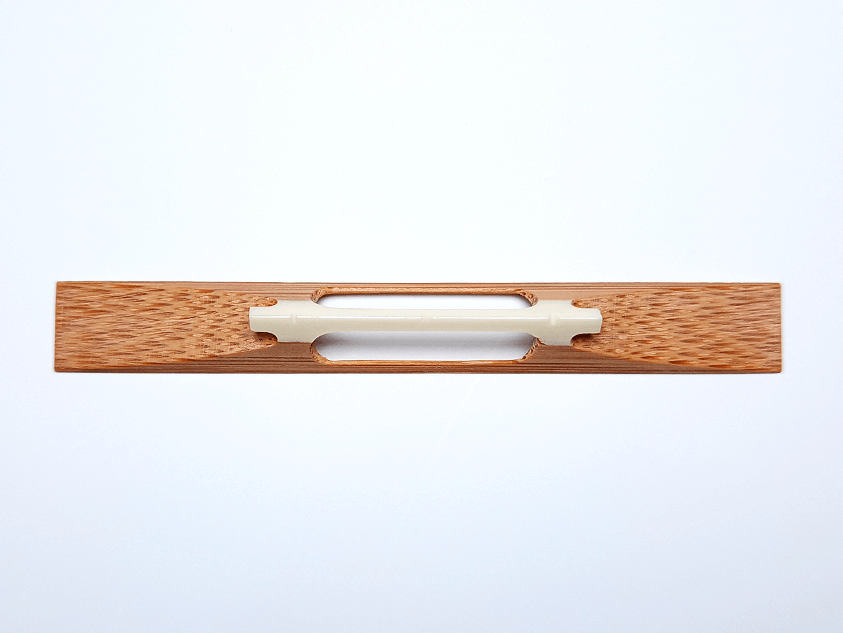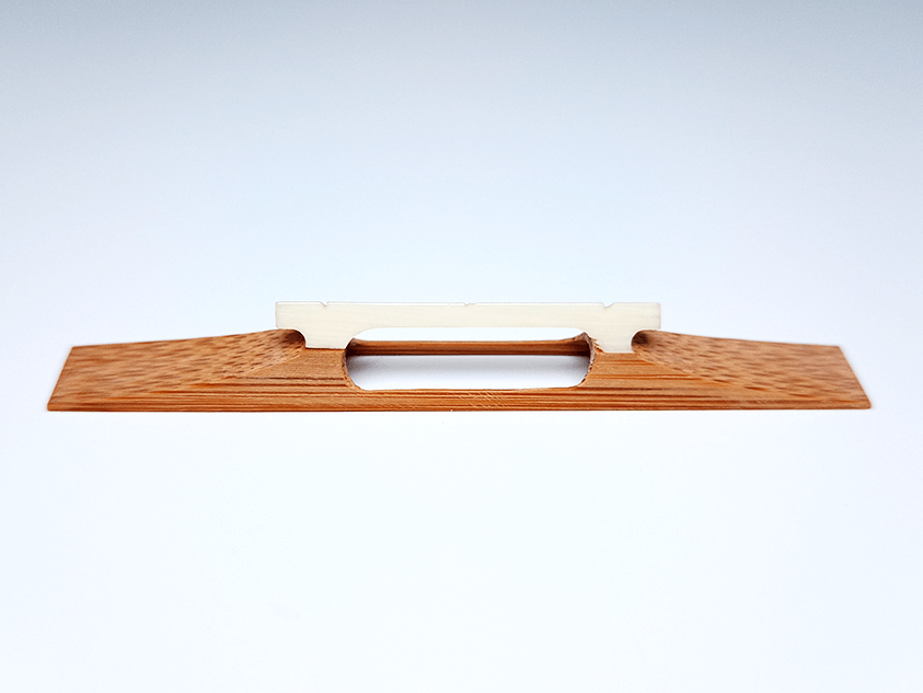 This bamboo koma is for Tsugaru playing style. Tsugaru style koma are lower and narrower than koma for other styles and make it easier to strike through the string all the way to the skin. They’re also commonly used for Minyo playing style.