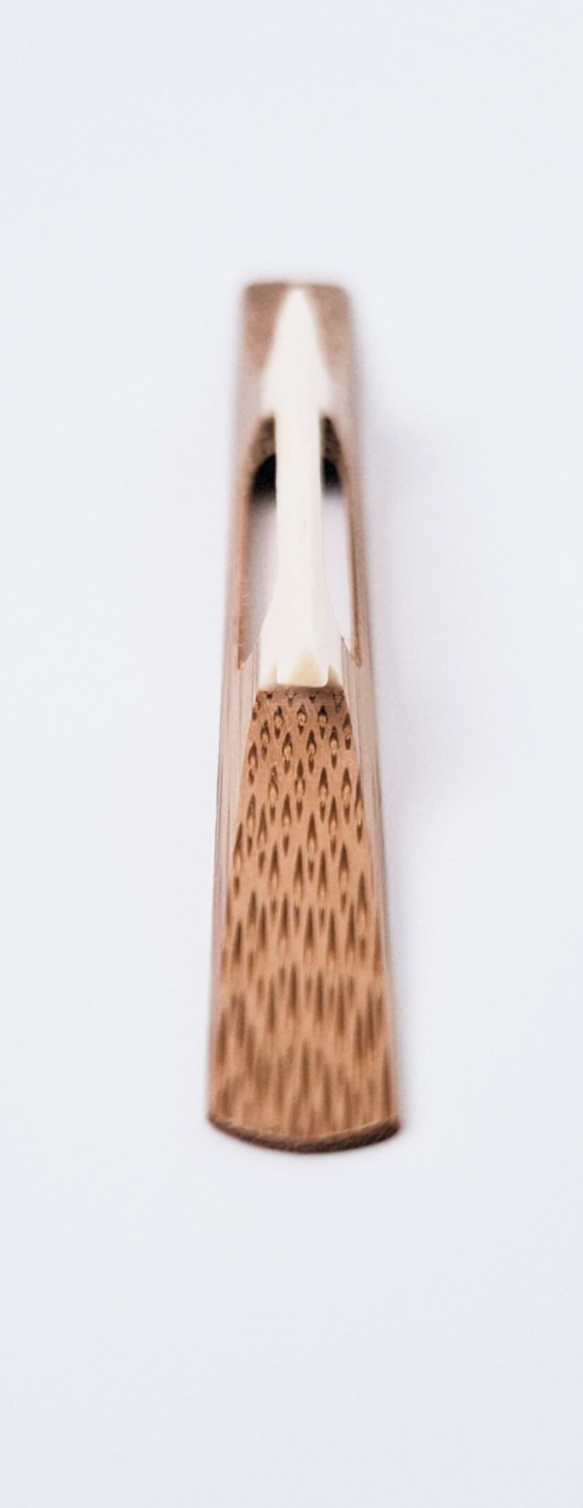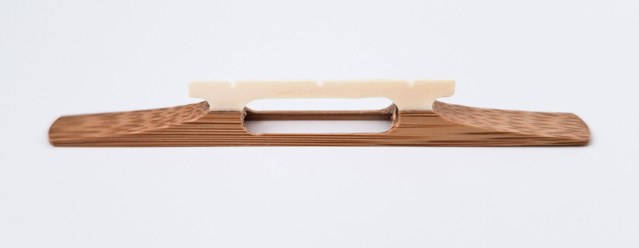 This bamboo koma is for Tsugaru playing style. Tsugaru style koma are lower and narrower than koma for other styles and make it easier to strike through the string all the way to the skin. They’re also commonly used for Minyo playing style.