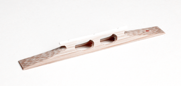 This bamboo koma is for Tsugaru playing style. Tsugaru style koma are lower and narrower than koma for other styles and make it easier to strike through the string all the way to the skin.