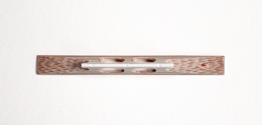 This koma has a bone tip inlay that will provide a clean sound. It’s on the narrower end of the spectrum which increases the crispness of your shamisen’s sound. It’s also pretty low which is fantastic for oshibachi-intense pieces (in my experience). It has an extra sturdy shape due to the middle bamboo section at the very center of the koma.