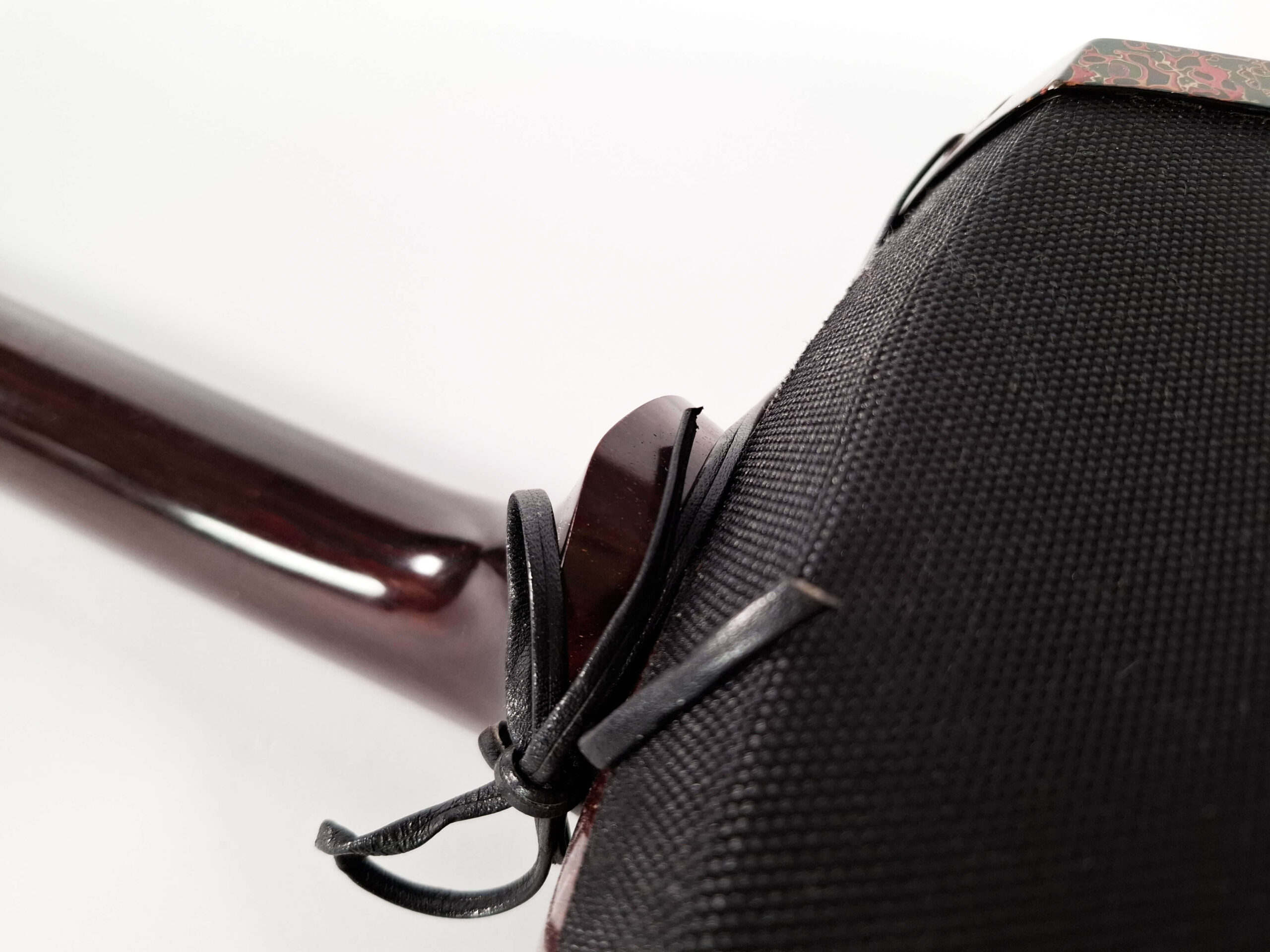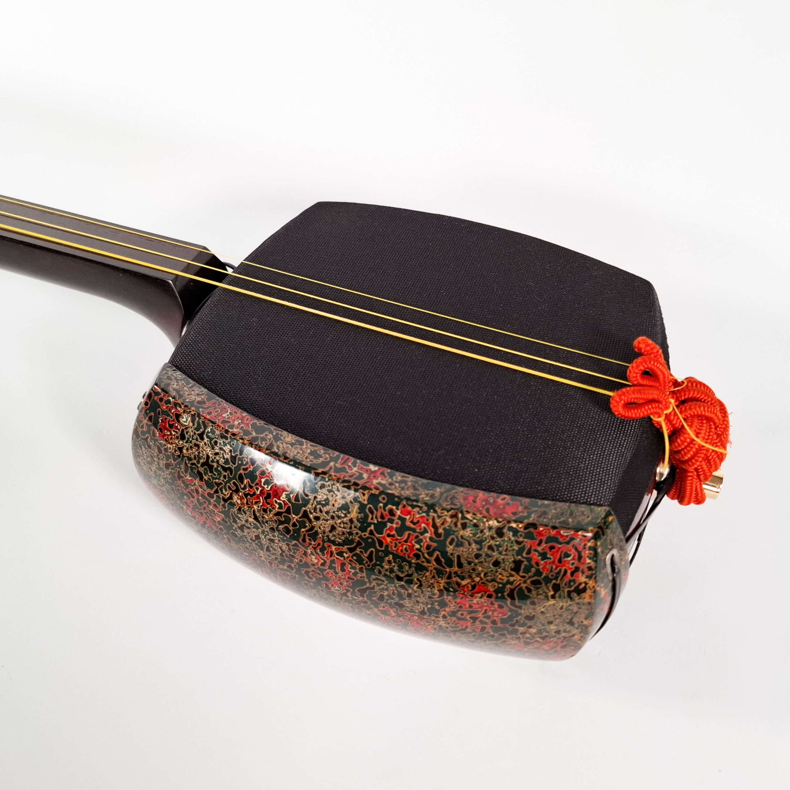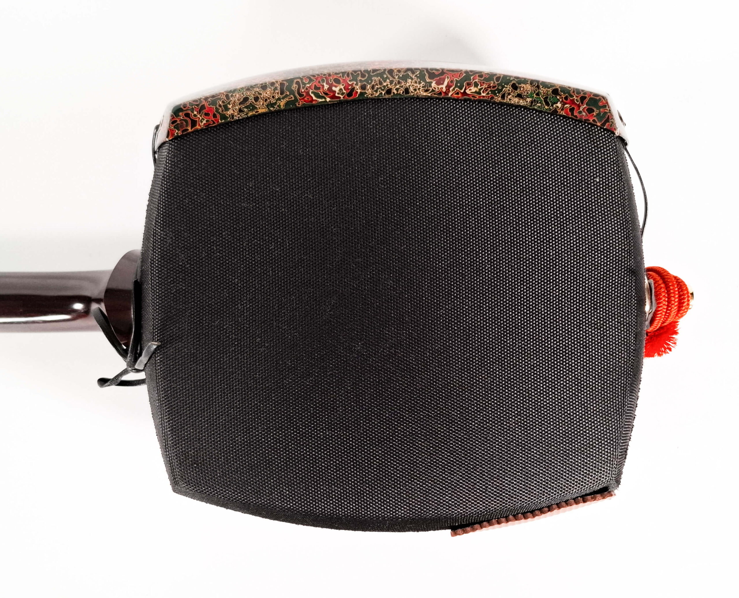The instrument comes with a vibrant red neo and a classic authentic tsugaru lacquer doukake. I think this combo just looks stunning with the black skins! Also included in the package are a set of fresh strings, a tenjin cap, and a dougomu.