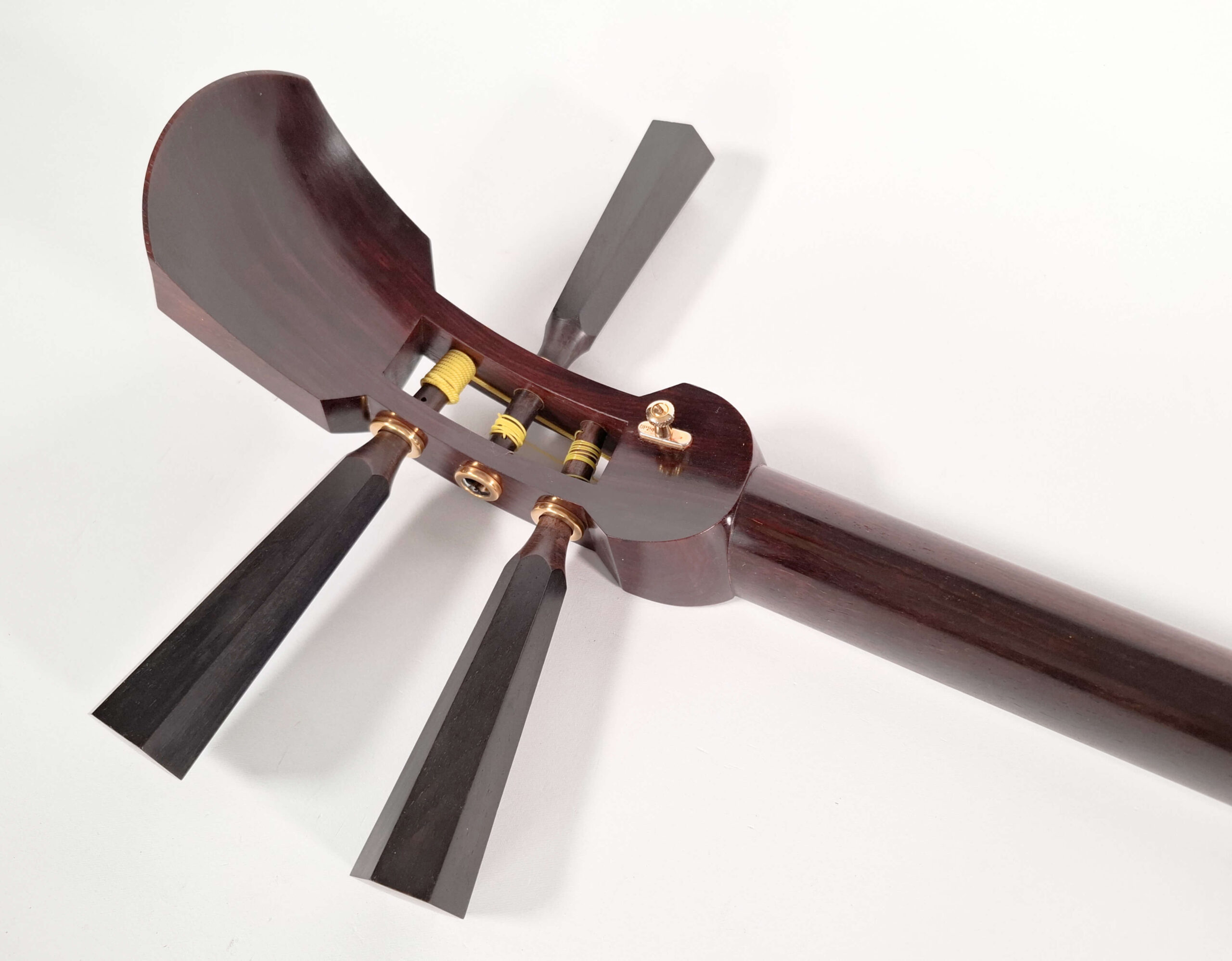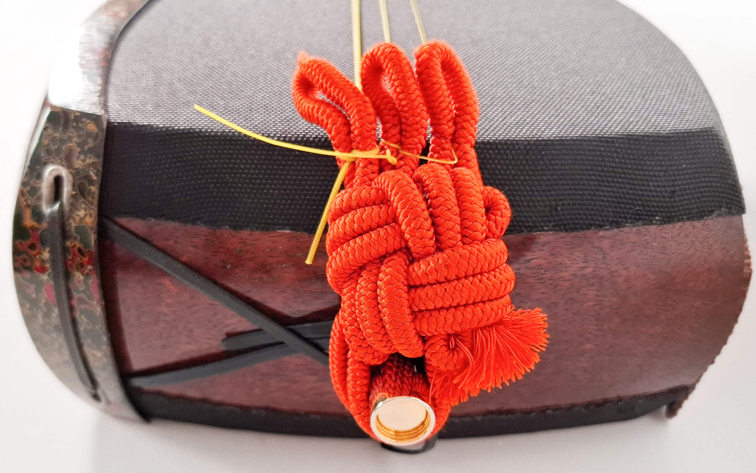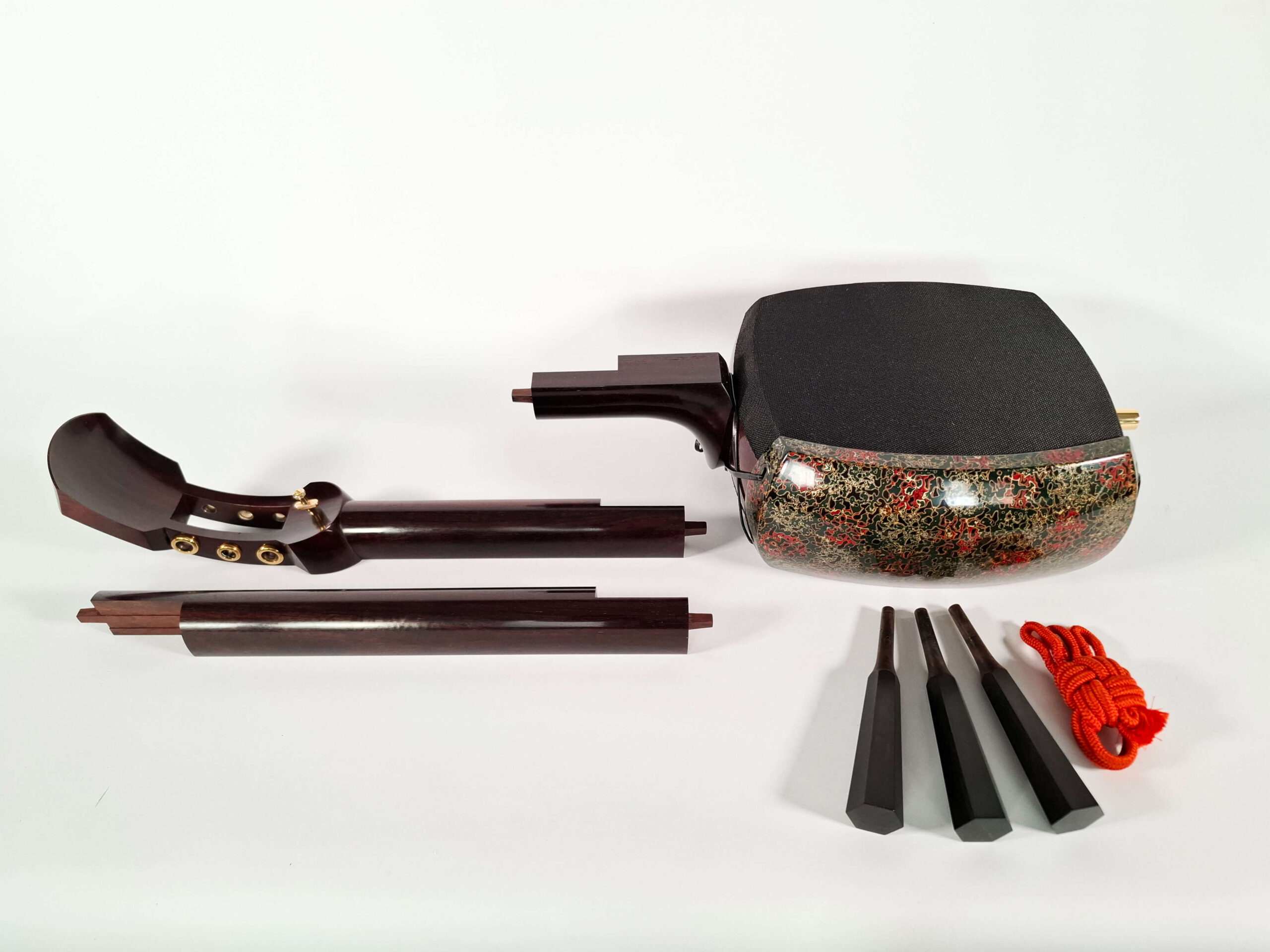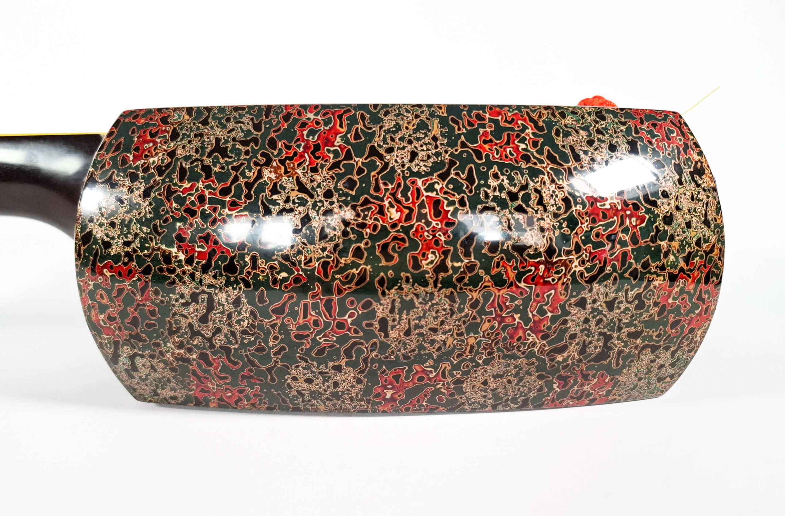 The instrument comes with a vibrant red neo and a classic authentic tsugaru lacquer doukake. I think this combo just looks stunning with the black skins! Also included in the package are a set of fresh strings, a tenjin cap, and a dougomu.