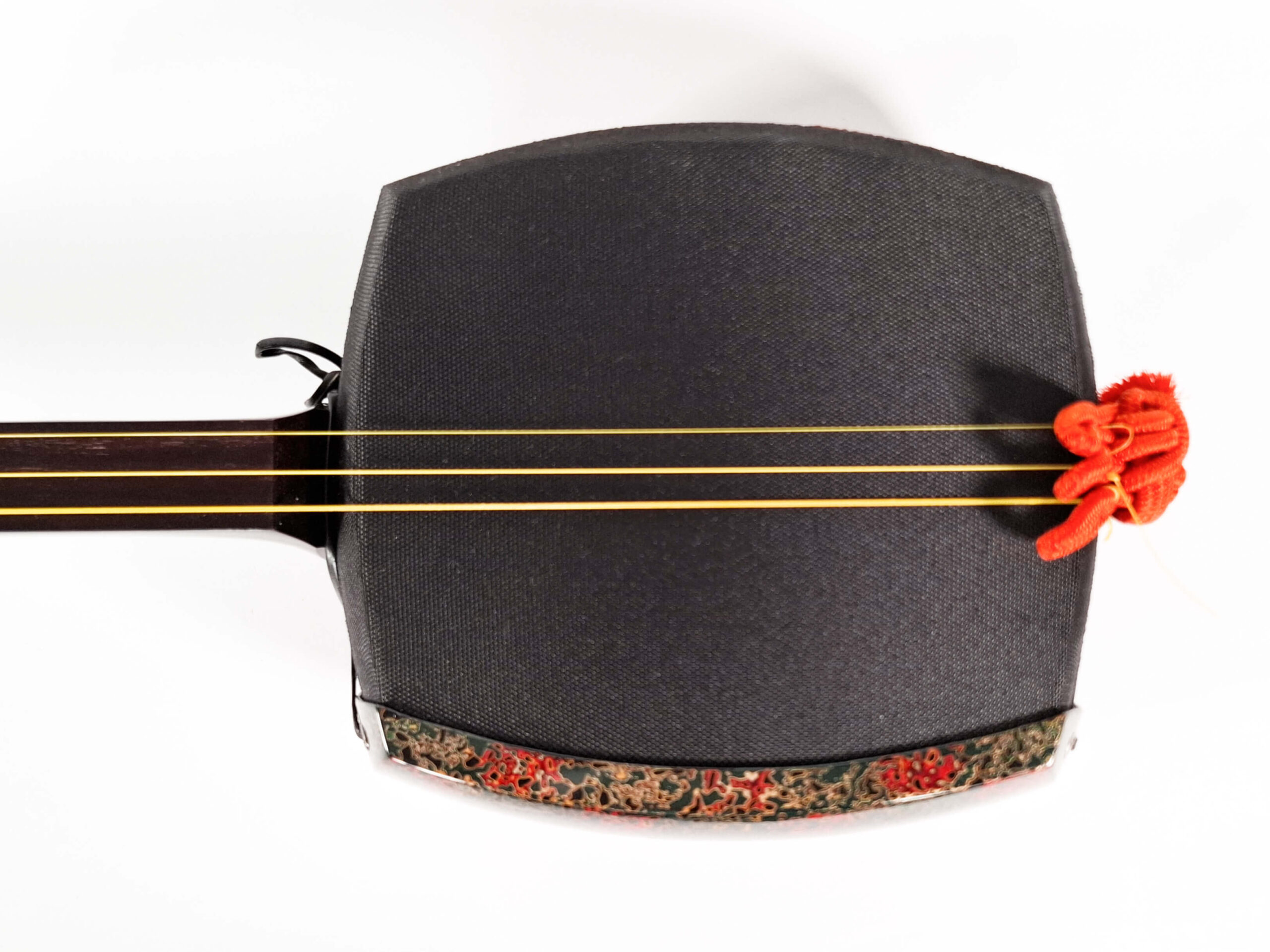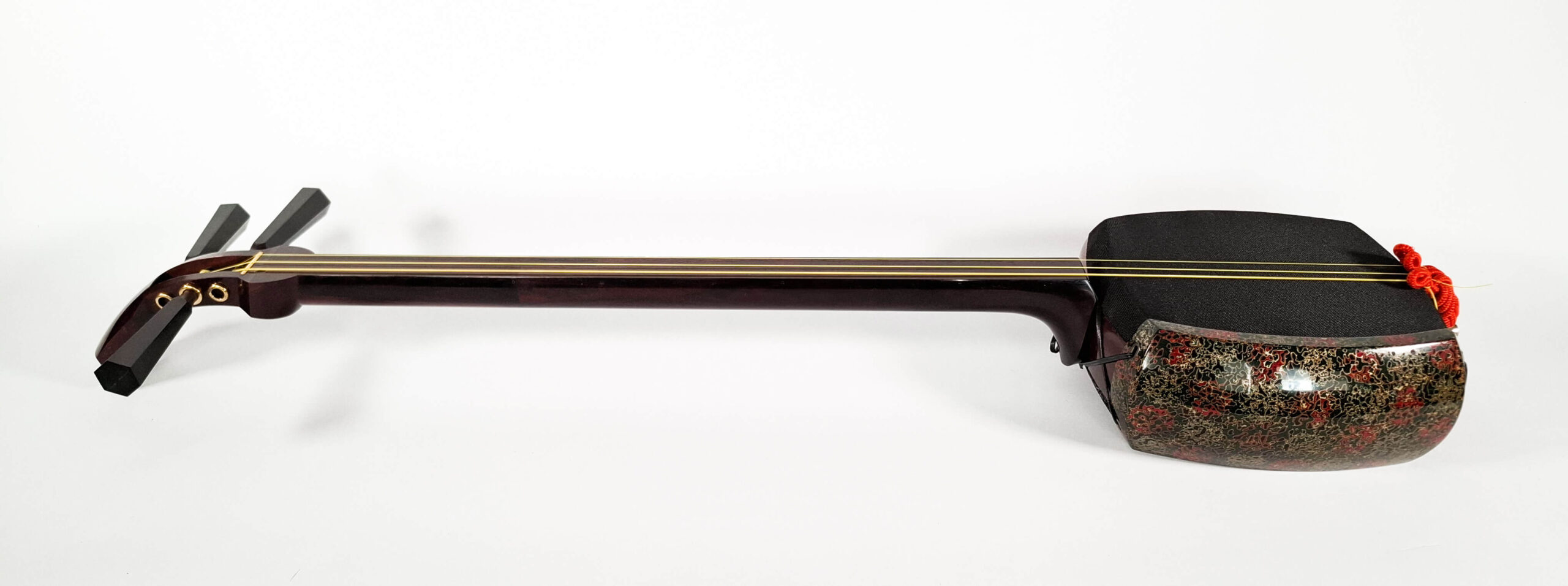 This instrument’s neck is made from koki wood – the most sought-after wood in contemporary shamisen culture. Marvel in its dark sheen and beauty!