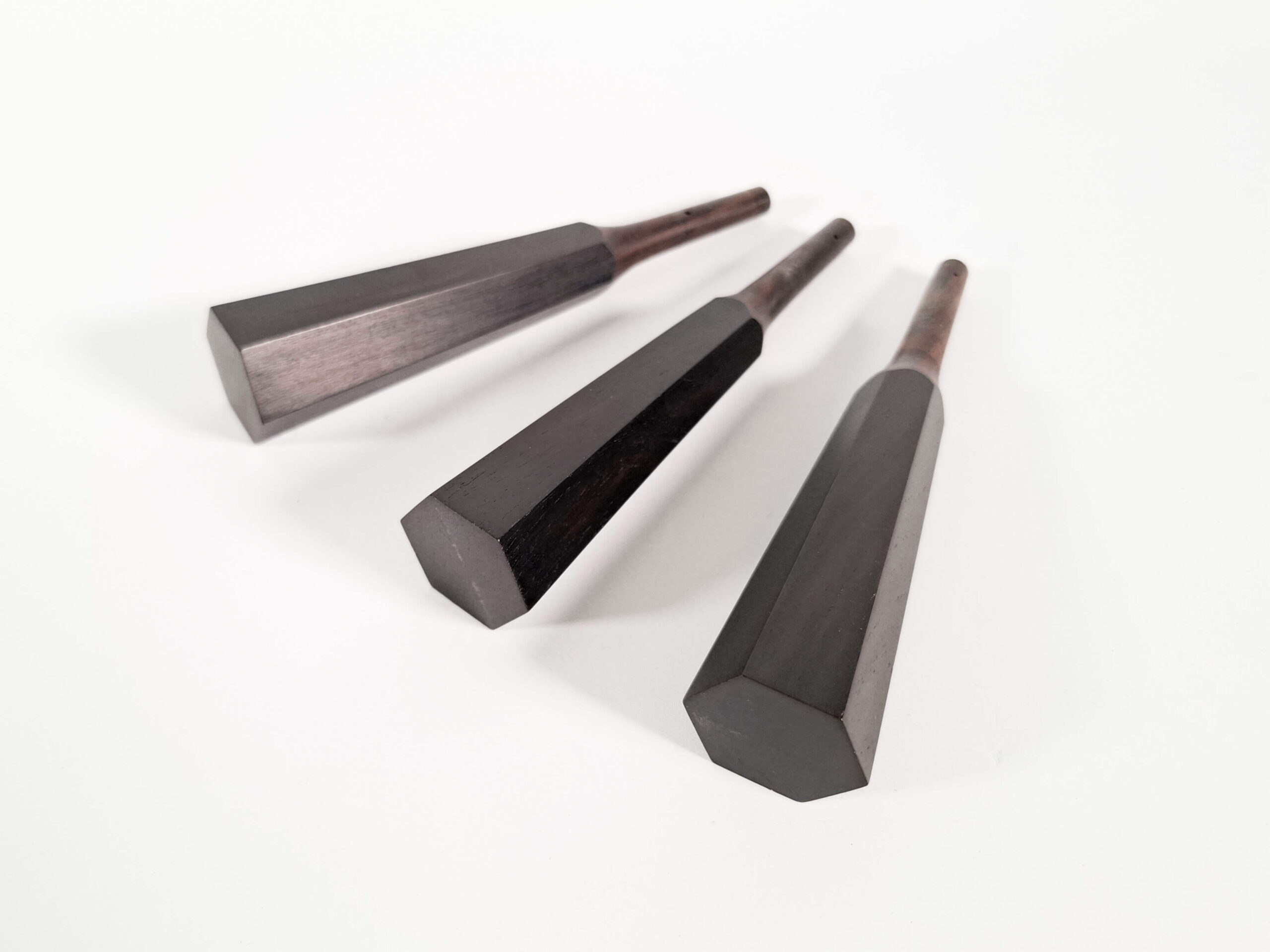 The itomaki (tuning pegs) are made from an unknown mysterious material! They’re nice and heavy like zouge and very hard. I like heavy itomaki because they give the shamisen’s head some weight – but that’s personal preference. They look super cool for sure and are a sweet contrast to the dark overall design of Touji.