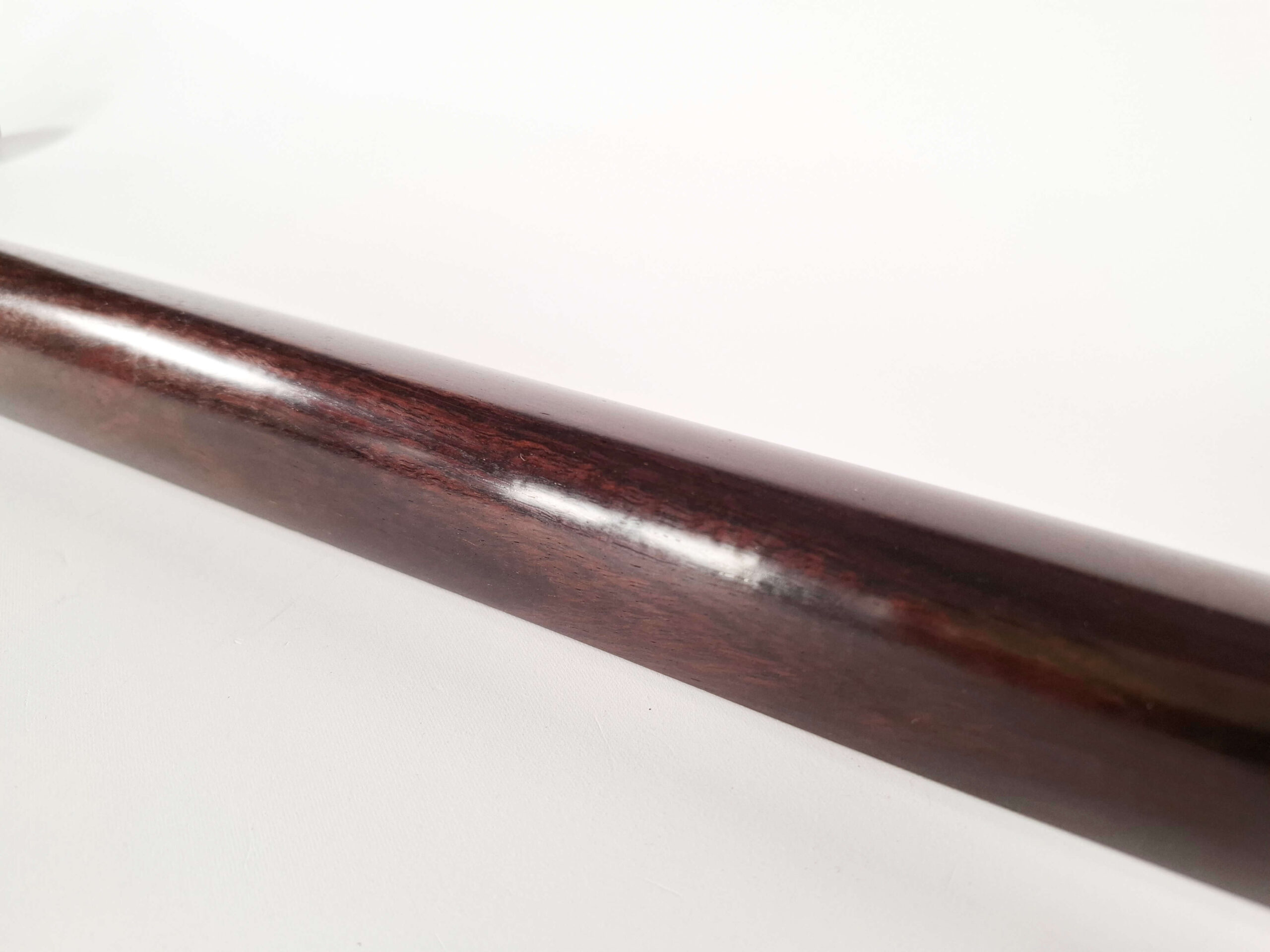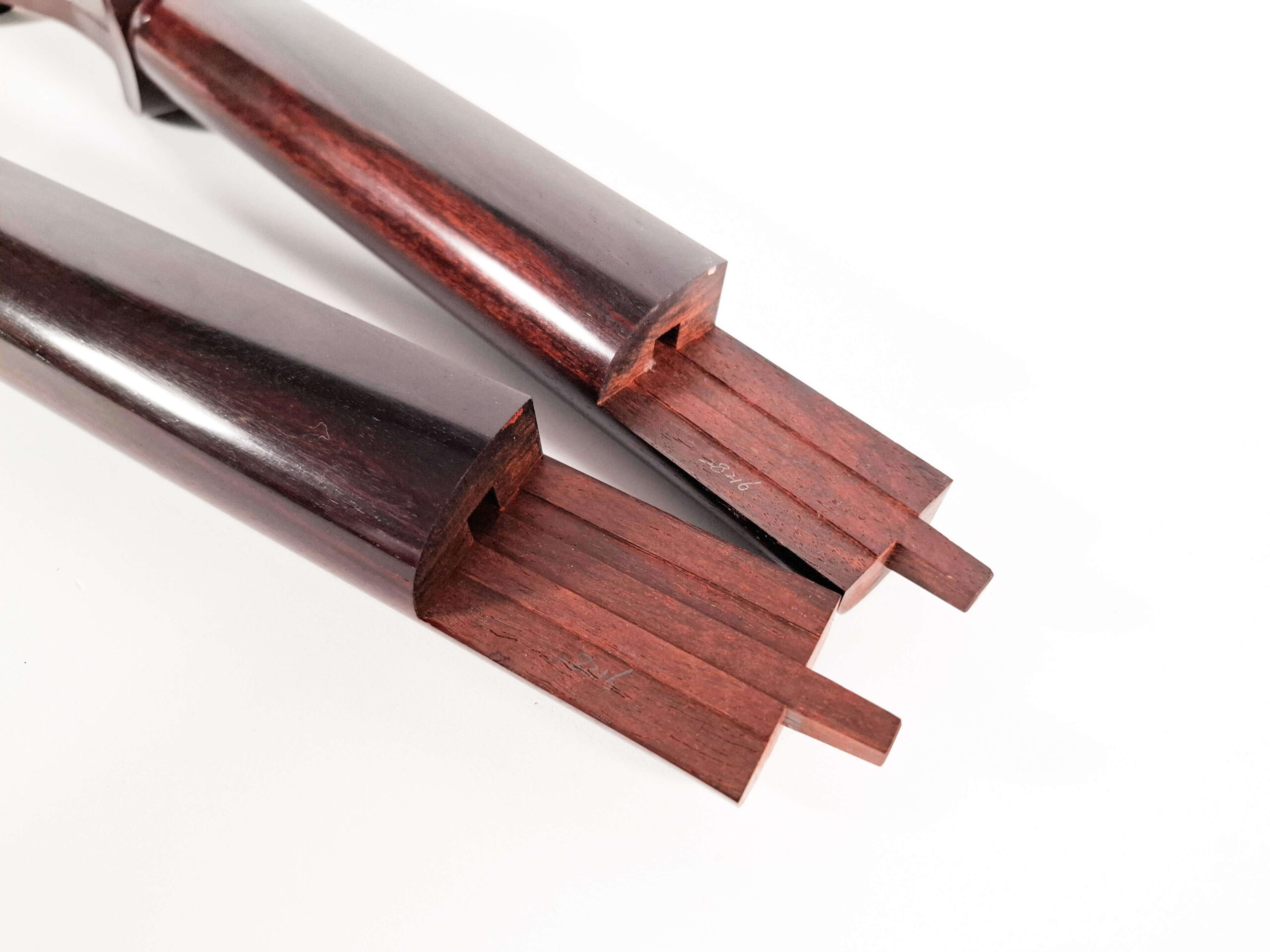 The tsukigata (the curved end of the tenjin) is in perfect condition, and the instrument’s wood has a luscious deep color and beautiful grain. The neck is crafted in mitsuori style: It can be separated into three pieces and makes travelling with the instrument super easy even if you have to travel with small luggage. The joints are very well crafted which will provide an extra tight fit. They come together with a very satisfying “clack” – if you don’t know what that means: it’s a very good thing and you’re gonna love it!