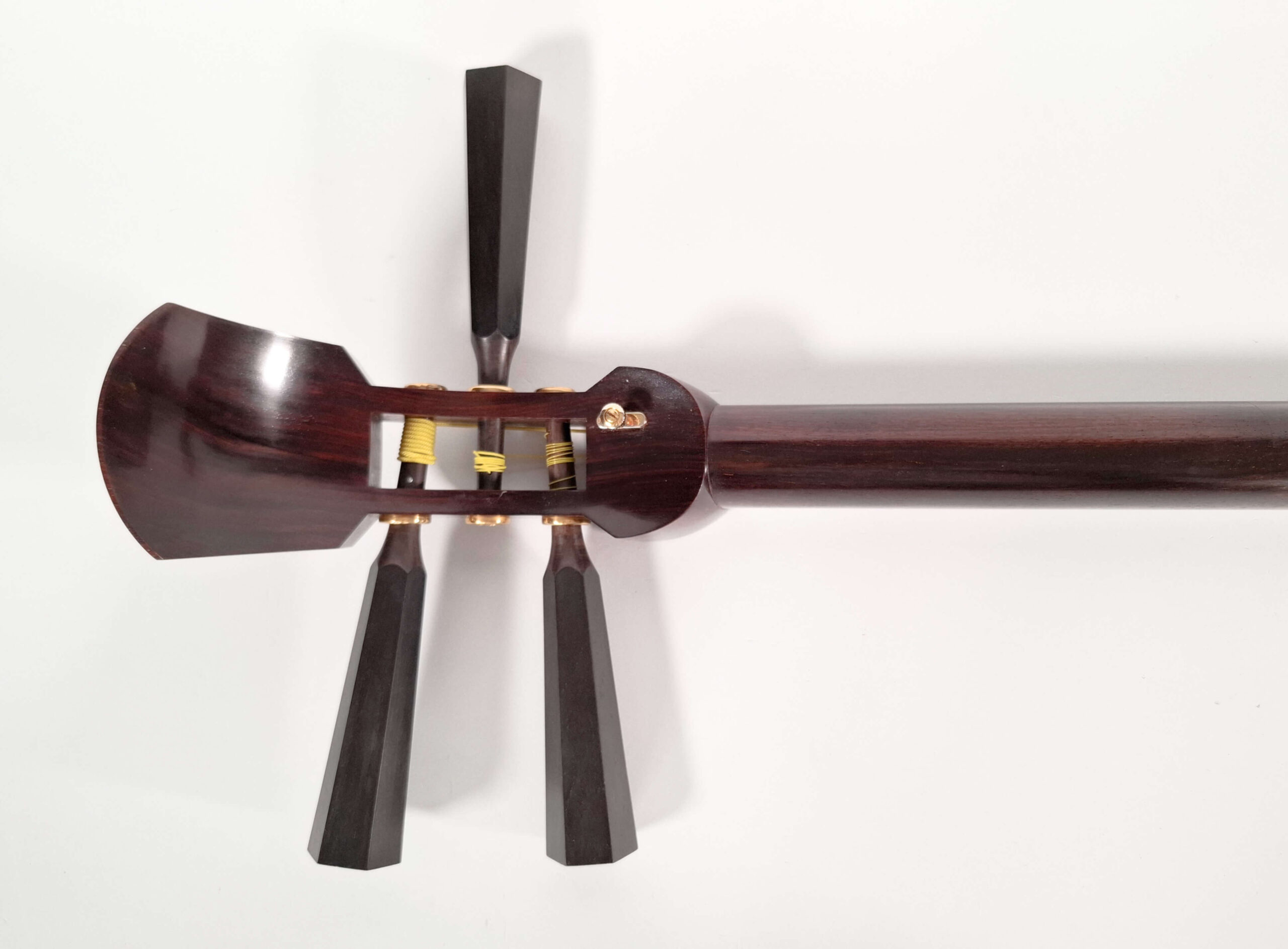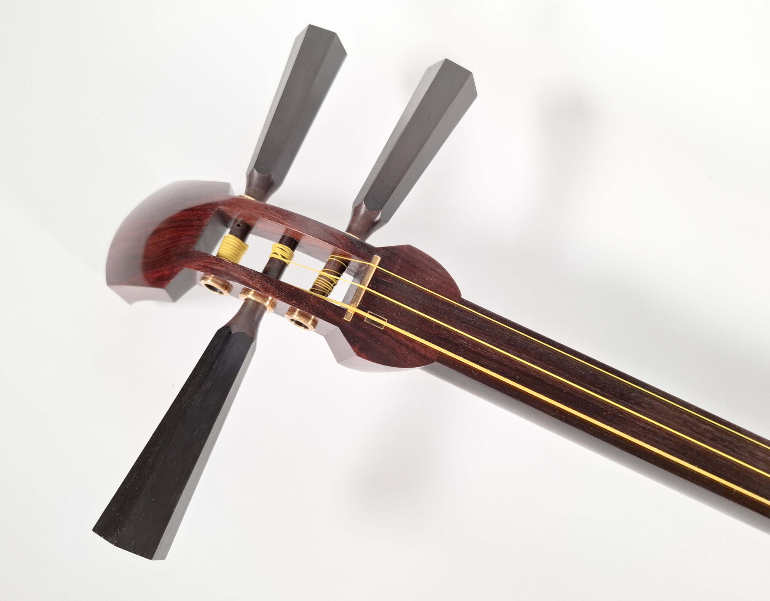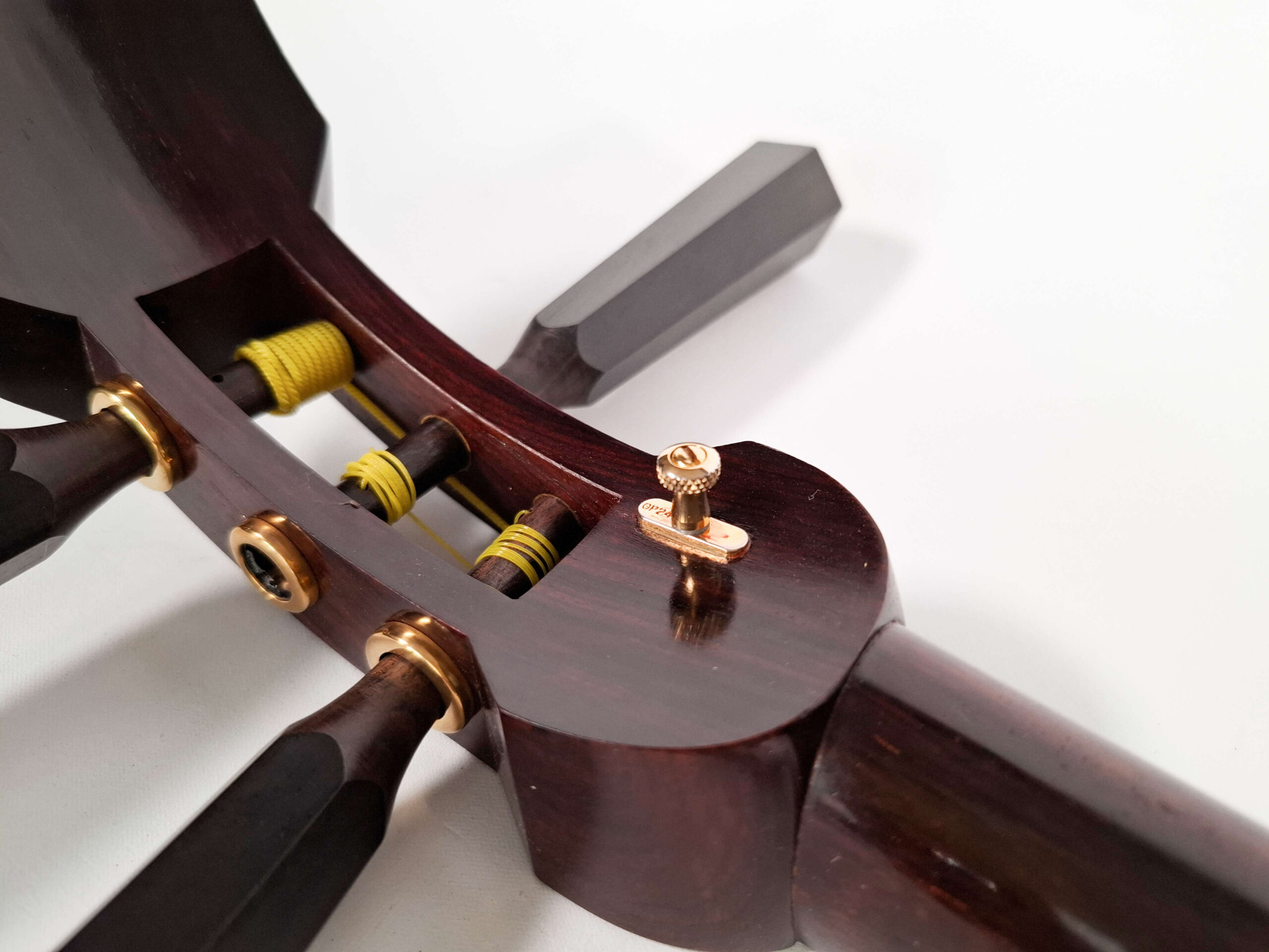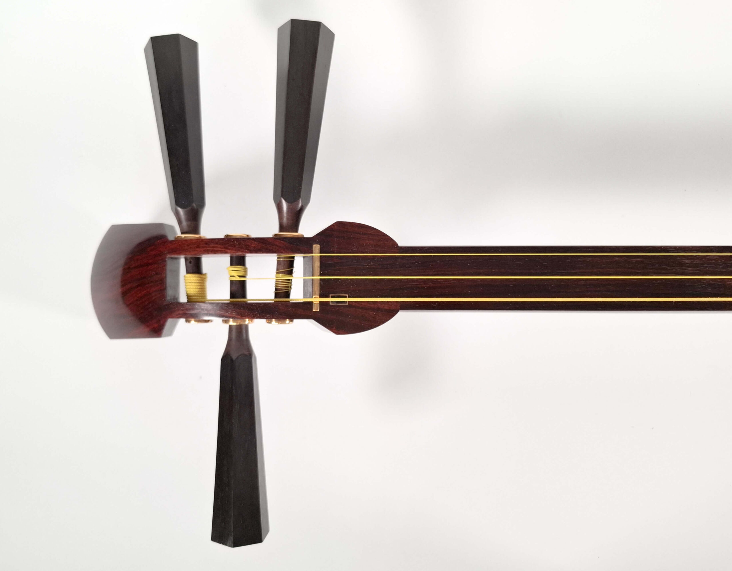 This neck is 33,75 mm wide and 34 mm high at the top and widens slightly towards the dou. The fingerboard is 30,5 mm wide at the narrow end. Its hatomune – the part where the neck enters the sound box – ends in a sharp edge that makes it possible to play up to position 20 and slightly beyond on this instrument.